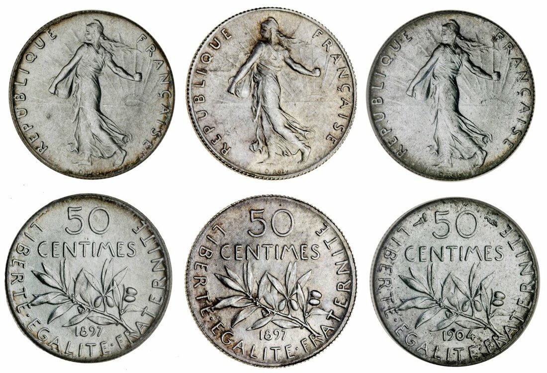 France, Third Republic (1870-1940), 50-Centimes, 1897 (2); additionally, 1904 (Le Franc 190; Gad 420; KM 854), the second lustrous, much as struck, the first and third choice mint state, and in early PCGS holders, graded MS64 [3]