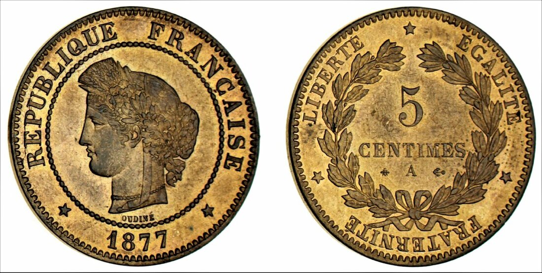 France, Third Republic (1870-1940), 5-Centimes, 1877-A, Paris (Le Franc 118.15; Gad 157a), choice mint state, very rare thus