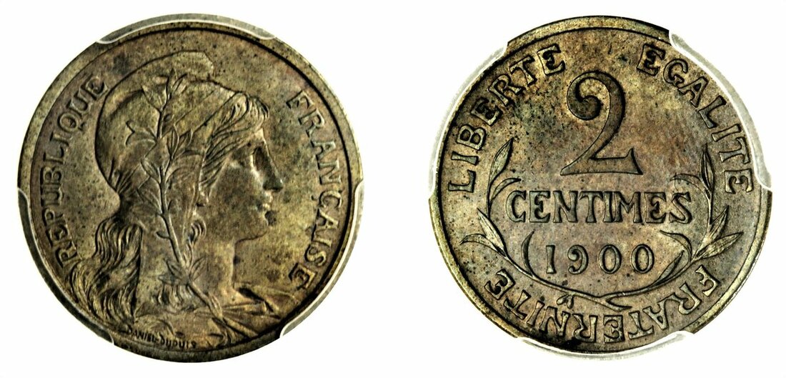 France, Third Republic (1870-1940), 2-Centimes, 1900, by J B Daniel-Dupuis (Gad 107; KM 841), very scarce in this state, in PCGS holder, graded MS62BN