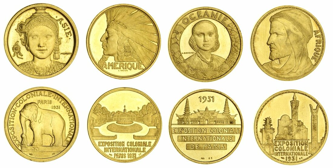 France, Colonial Exhibition, Paris, 1931, gilt AE 4-Medal set, including, Asia {Elephant}; America {Indian Head}; Oceania; Africa, a pleasing and popular set, light hairlines, otherwise good extremely fine to about uncirculated, in fitted case of issue [4]