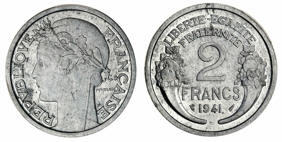 France, under Nazi Occupation ~ 'État Français' (1940-44), Specimen 2-Francs, 1941, by Morlon, in aluminium, laureate head left, rev. denomination and date flanked by cornucopias, 2.9g (Gad 535a; Gem 114.5), flashy surfaces much as struck, in PCGS holder, graded SP64