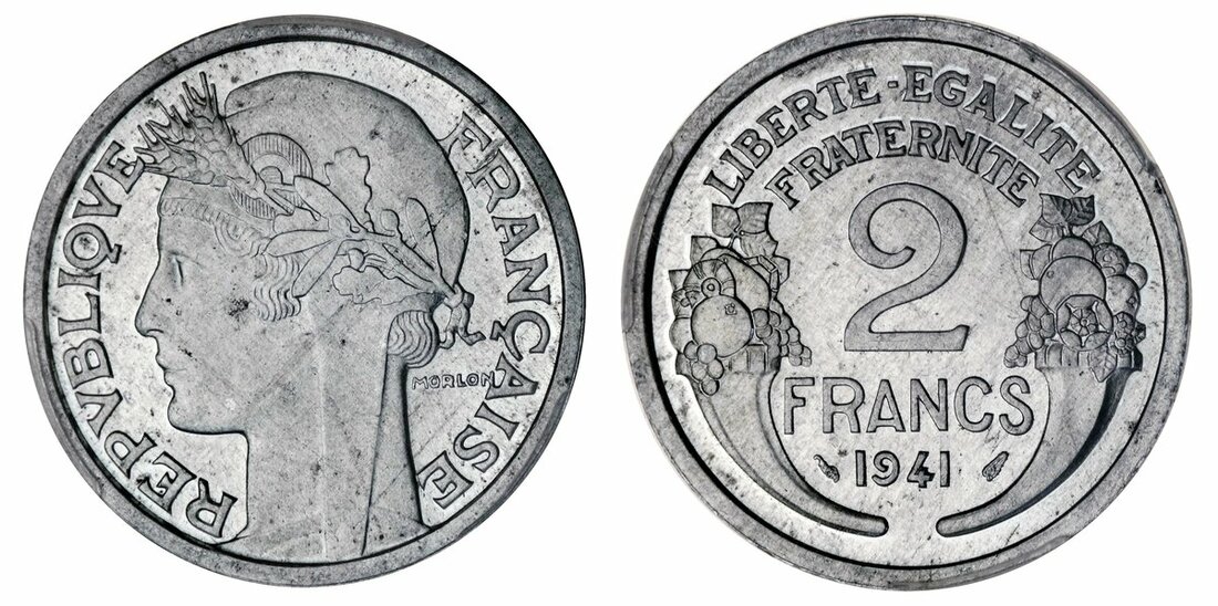 France, under Nazi Occupation ~ 'État Français' (1940-44), Specimen 2-Francs, 1941, by Morlon, in aluminium, laureate head left, rev. denomination and date flanked by cornucopias, 3.1g (Gad 535a; Gem 114.5), flashy surfaces much as struck, in PCGS holder, graded SP64