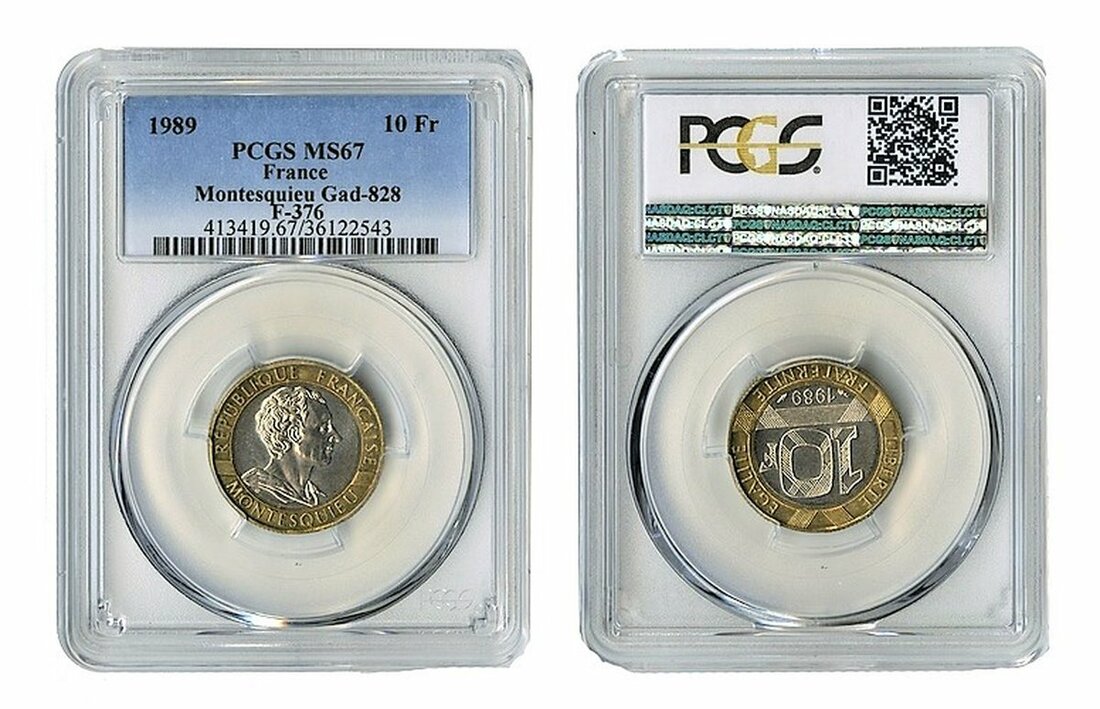 France, Fifth Republic (1958-present), Bimetallic 10-Francs, 1989, Tricentenary of the Birth of Montesquieu (Le Franc 376; Gad 828; KM 969), a mintage of only 15,000 pieces, in PCGS holder, graded MS67