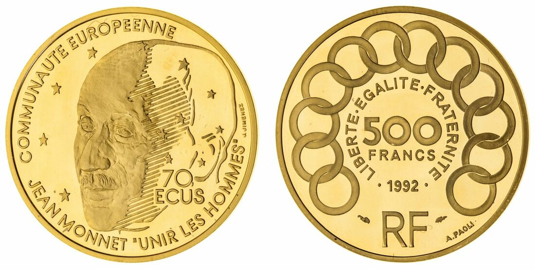 (g) France, Fifth Republic (1958-present), gold 500-Francs, 1992, 'European Community' ~ JEAN MONNET, brilliant uncirculated