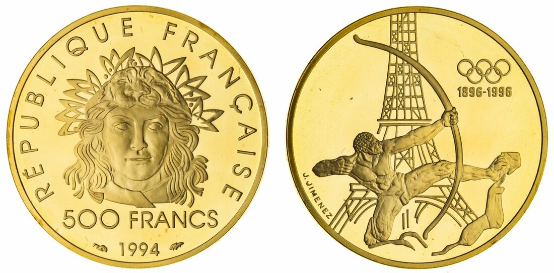 (g) France, Fifth Republic (1958-present), gold 500-Francs, 1994, Centenary of the Modern Olympic Games, 1896-1996, in the run up to Atlanta '96 (Fb 657; KM 1059), brilliant uncirculated