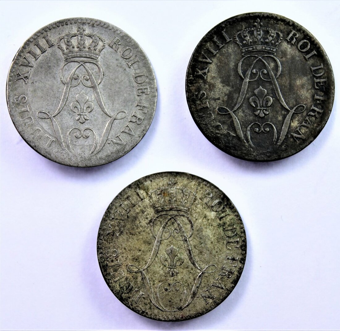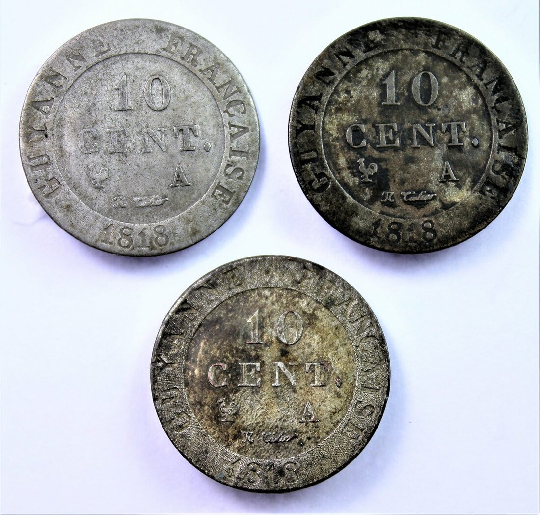 French Guiana, Louis XVIII (1814 / 1815-24), 10-Centimes, 1818-A [3] (Lecompte 30; KM 19.A1), fine to very fine, some surviving silvering [3]