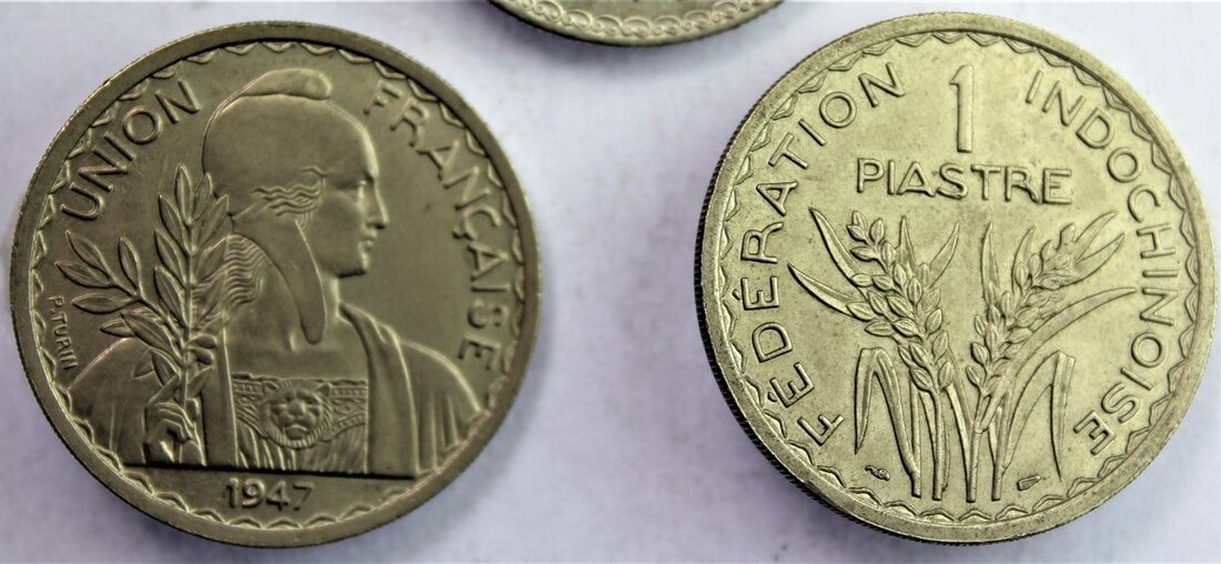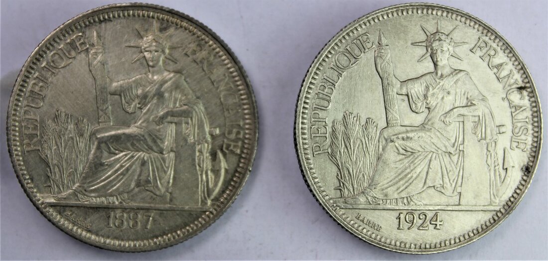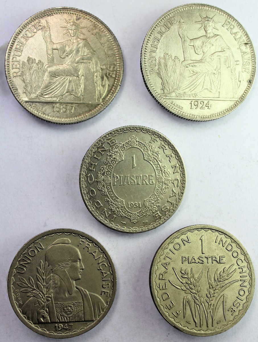 French Indochina, Piastres [5], 1887; 1924; 1931; 1947 (KM 5; 5a1; 19; 32.2), the first quite harshly cleaned, otherwise generally very fine or better (5)