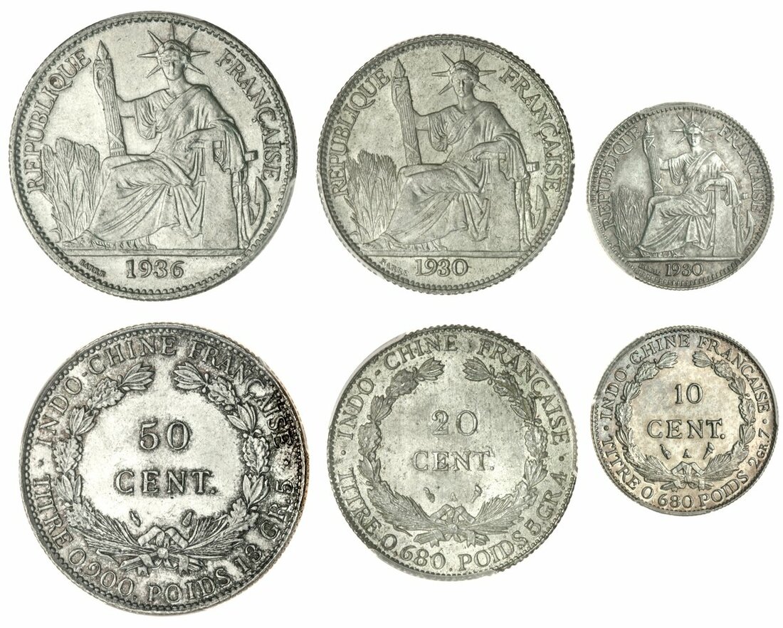 French Indochina, 50-Cents, 1936 (Gad 32; Lecompte 261; KM 4A.2); 20-Cents, 1930-A (Lecompte 230; KM 17.1); and, 10-Cents, 1930-A (Lecompte 170; KM 16.1), in PCGS holders, graded MS63, MS65 and MS63 respectively (3)
