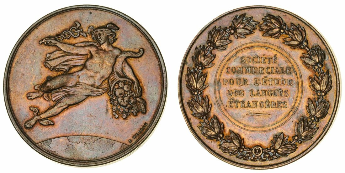 France, Commercial Society for the Study of Foreign Languages, AE Medal, L Merley, stamped BRONZE on edge, 51mm. 68.27g, lightly wiped, otherwise very fine; France, Fifth Republic, Giscard d'Estaing, AR Medal, Bicentennary of the United States, Visit, May 1976, 50.5,mm. 51.83g, stamped ARGENT on edge, light handling marks in otherwise brilliant fields, extremely fine or better; France, Fifth Republic (1958-present), gold Proof 5-Euros, 2012, "Tenth Anniversary of the Euro", brilliant uncirculated, in fitted case of issue, with certificate of authenticity no. 07727