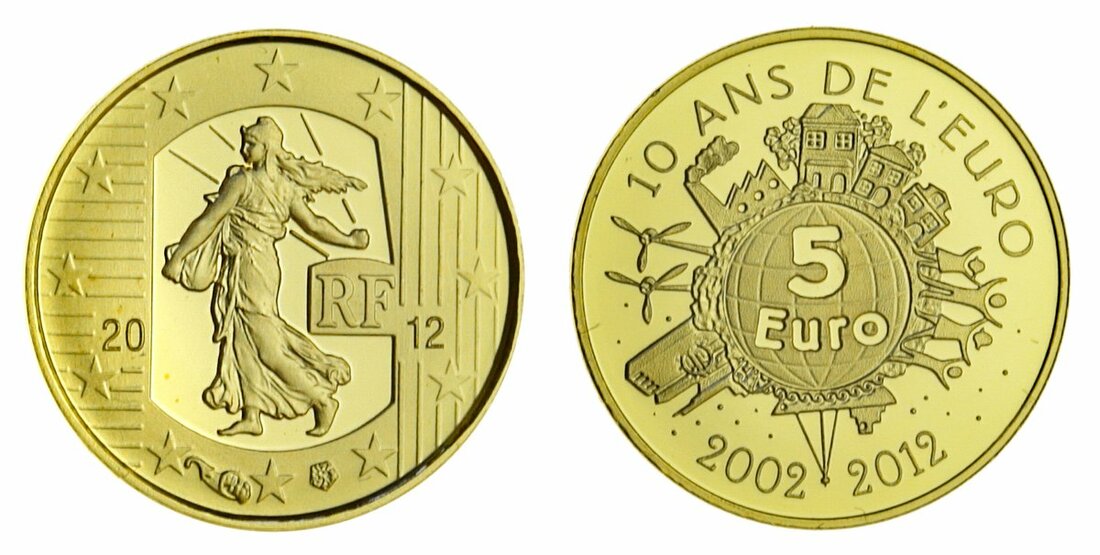 France, Commercial Society for the Study of Foreign Languages, AE Medal, L Merley, stamped BRONZE on edge, 51mm. 68.27g, lightly wiped, otherwise very fine; France, Fifth Republic, Giscard d'Estaing, AR Medal, Bicentennary of the United States, Visit, May 1976, 50.5,mm. 51.83g, stamped ARGENT on edge, light handling marks in otherwise brilliant fields, extremely fine or better; France, Fifth Republic (1958-present), gold Proof 5-Euros, 2012, "Tenth Anniversary of the Euro", brilliant uncirculated, in fitted case of issue, with certificate of authenticity no. 07727