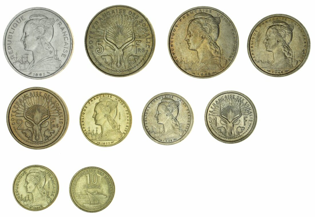 French Somaliland, Essais (10), Pattern 5-Francs [3], 1948 [2]; another, 1965 (KM E3, E6); also, Pattern Franc [2], 1948 [2] (KM E2); also, Francs, 1948 [2] (KM E1); additionally, Pattern 20-Francs, 1952 (KM E4); also, Pattern 10-Francs, 1965 [2] (KM E5), all about uncirculated or brilliantly so; additionally, Currency issues [6], 5-Francs [3], 1948 [2]; another, 1965 (KM 6; 10); 2-Francs [3], 1949; another, 1959; also, 1965 (KM 5, KM 9 x 2), extremely fine or better [16]