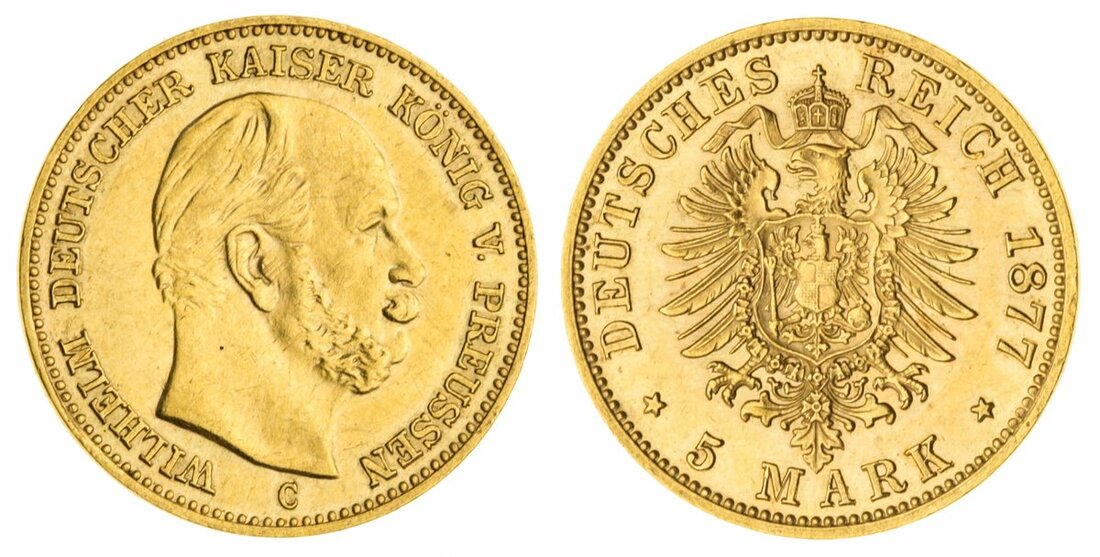 (g) Germany, Prussia, Wilhelm I (1861-88), gold 5-Mark, 1877-C, Frankfurt (Jaeger 244; Fb 3827; KM 507), lightly cleaned, otherwise a bolder very fine, the reverse better