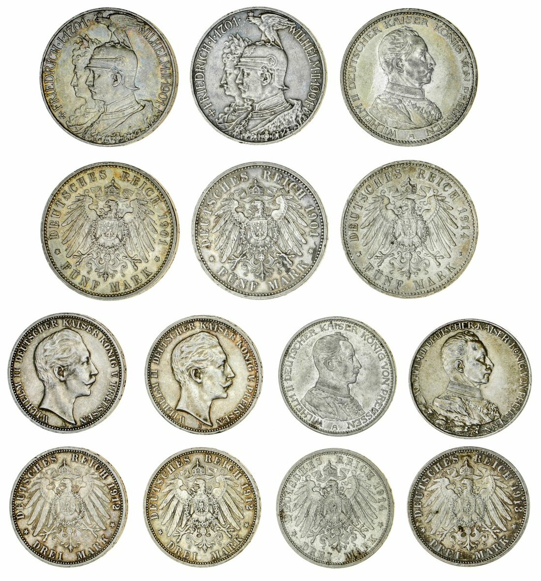 Germany, Prussia, Wilhelm II (1888-1918), 5-Mark (3), 1901, Commemorating Bicentenary of Kingdom of Prussia [2] (KM 526); another, 1914-A, uniformed bust (KM 536); additionally, 3-Marks (4), 1912-A [2] (KM 527); 1913 (KM 535); lastly, 1914-A (KM 538), some once cleaned, otherwise all a bolder very fine or better (7)