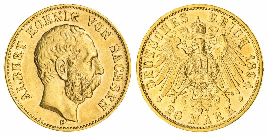 (g) Germany, Saxony Albertine (1873-1902), gold 20-Mark, 1894-E, Muldenhutten (Jaeger 264; Fb 3842; KM 1248), possibly once wiped, otherwise lustrous, good very fine