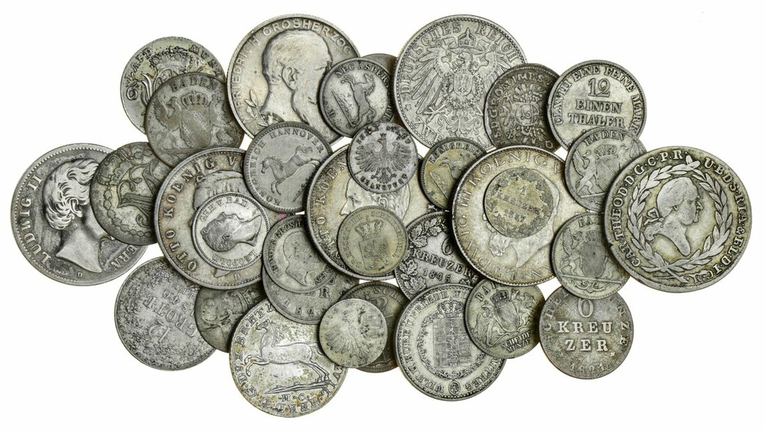 Germany, States, miscellaneous silver coins [31], including: Bavaria, 20-Kreuzer, 1795 (KM 256); 6 Kreuzer, 1802 (KM 639); Hesse, 6-Kreuzer, 1845 (KM 318); Kreuzer (KM 339); Brunswick, 1/6-Thaler, 1791 (KM 1001); Oldenburg, Groschen, 1858 (KM 193), an interesting group, good fine to very fine (31)
