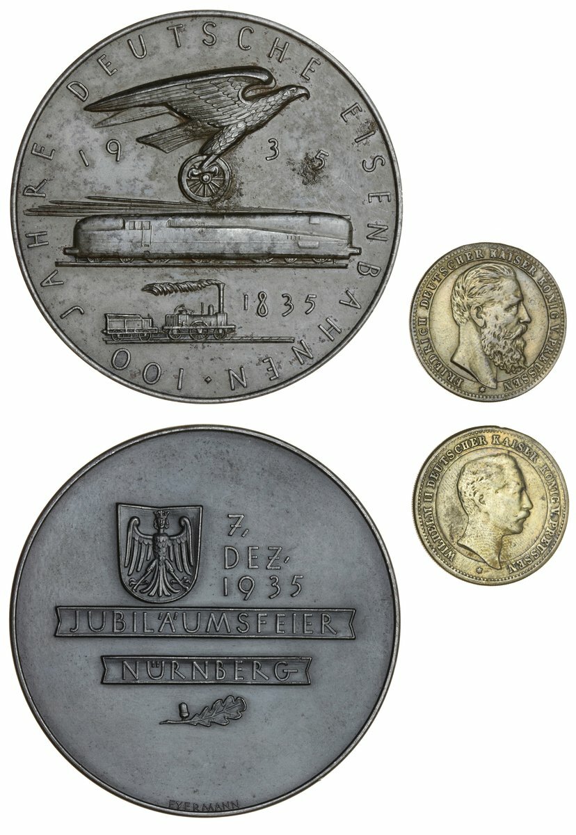 Germany, Centenary of the Eisenbahnen, 1935, iron Medal, by Bruno Eyermann, for Nuremberg Jubilee Celebrations, 70mm., 137.80g, light spots of corrosion, otherwise very fine; also Friedrich II and Wilhelm II, AE Medallet, fine [2]