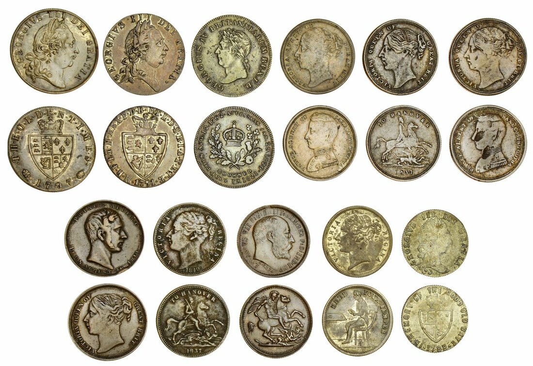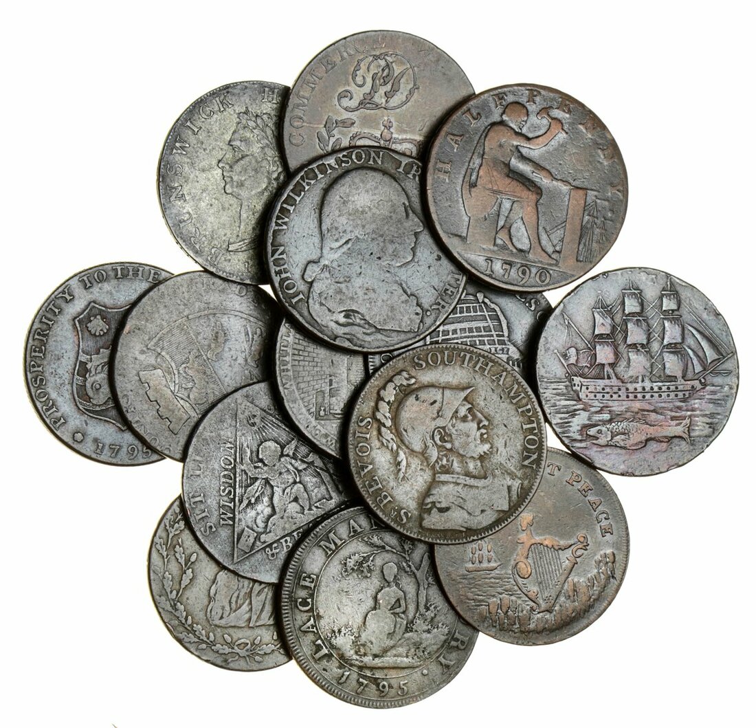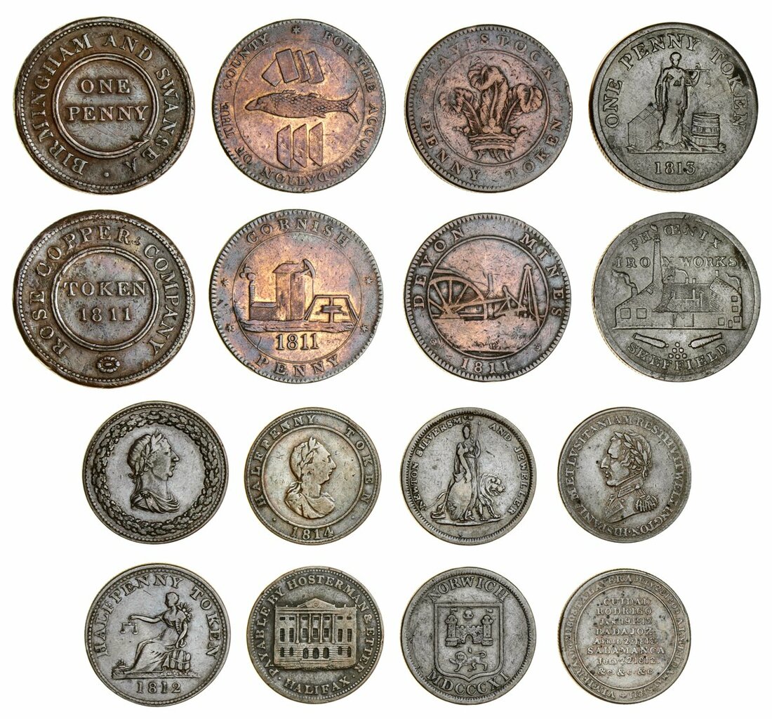 Great Britain, 18th-19th Century Tokens, Pennies [4], Birmingham and Swansea, Rose Copper Co., 1811; Cornwall, Local Accommodation, 1811; Devon, Tavistock Mines, 1811; Sheffield, Pheonix Iron Works, 1813; also, Canada, Wellington Tokens [2] (Courteau 4-22); additionally, Halfpennies [17], including, Anglesey, Parys Mines, 1793 (D&H 12), Carmarthenshire, I. Morgan (D&H 5); Dorset, Poole, James Bayley, 1795 (D&H 6); Hampshire, Southampton, 1791 (D&H 79); Ireland, Dublin, 'God Grant Peace'; Kent, 'Wooden Walls', 1795; another, Canterbury, 1795 (D&H 10, 12); Norfolk, Norwich, 1811; and, Suffolk (D&H 25); Warwickshire, John Wilkinson [2], 1787; another, 1790 (D&H 340, 424); Yorkshire, Halifax, Hosterman & Etter, 1814; London, Moore, 115 Great Portland Street, Lace Manufactory, 1795; and others [5], including 'Brunswick', 1795; 'Success to the Plough and Fleece'; 'Prince of Wales Elected 1790'; unsigned [2], 1796; 1812 (D&H 350, 389, 369b); fair to good fine, some previously cleaned; additionally, 'Gambling' Guinea [2], 1791; 1797; another, a Half-Guinea, 'In Memory of the Good Old Days', 1788; George IV, Coronation, 1821, AE Counter; finally, Victorian Brass counters and tokens {6}, including, Victoria and Albert [3]; To Hanover {2}; Keep Your Temper; and Edward VII, Imitation Sovereign, these generally fine or better (34)