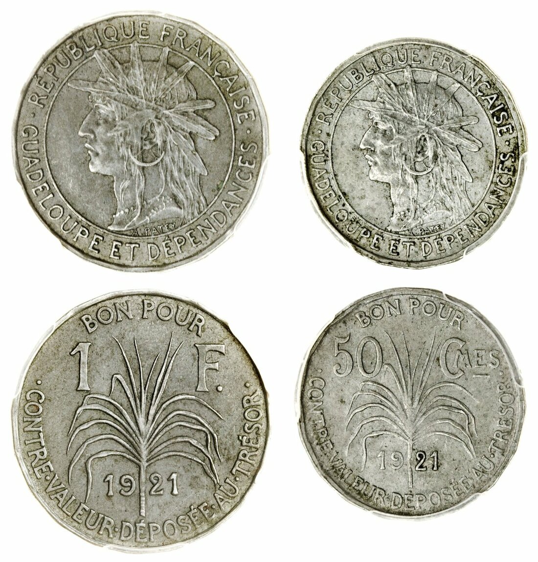 Guadeloupe, French Protectorate, {Bon Pour} {2}, Franc and 50-Centimes, 1921 (Lecompte 50, 58; KM 45-46), in PCGS holders, graded AU55 and AU58 (2)