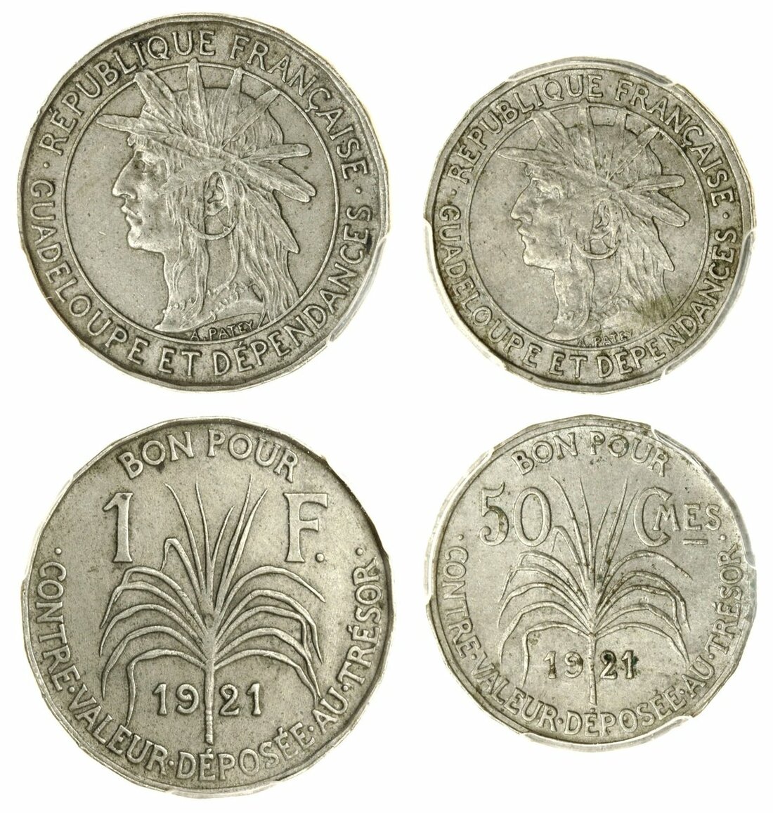 Guadeloupe, French Protectorate, {Bon Pour} {2}, Franc and 50-Centimes, 1921 (Lecompte 50, 58; KM 45-46), in PCGS holders, graded AU55 and AU58 (2)