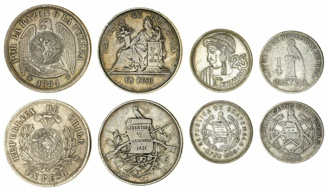 Guatemala [4], Peso, 1872-P (KM 197.1), toned, good fine, the rarer date; another, Counterstamped Coinage {1894), Peso, marked on 1884 Chilean Peso, 1884 (KM 216); also, Quarter-Quetzal, 1929 (KM 243.1); lastly, 25-Centavos, 1956 (KM 258), the penultimate worn, otherwise generally very fine, the last cleaned (4)