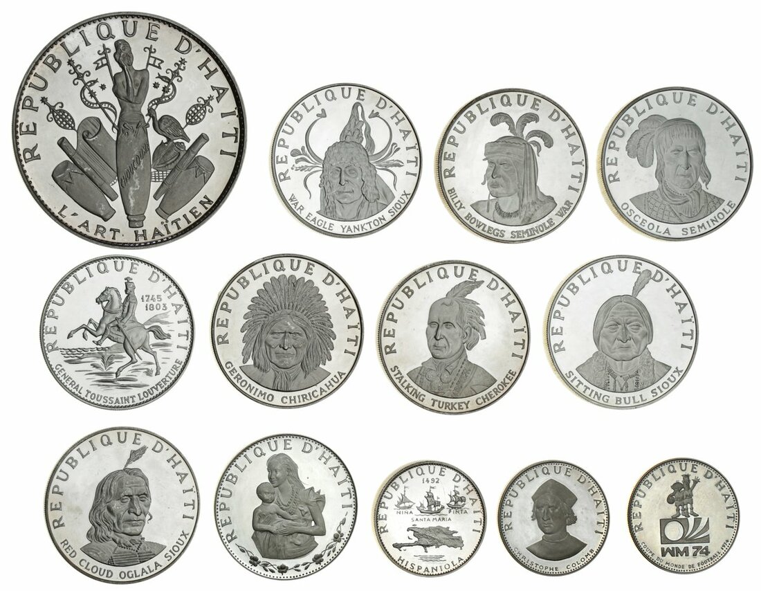 Haiti, Republic, silver commemorative coins, Proof 50-Gourdes, 1973 (KM 105); Proof 25-Gourdes (2), 1970-IC, 10th Anniversary of Revolution (KM 67.1); another, 1973 (KM 102); also, Proof 10-Gourdes (8), 1967, General Toussaint L'Overture (KM 65.1); others, 1970 (2), native American chiefs series, Osceola Seminole and Sitting Bull Sioux (KM 80; KM 79); alos, 1971 (5) Chiricahua {Apache} Chief - Geronimo (KM 82); Billy Bowlegs (KM 83); Yankton Sioux Chief - War Eagle (KM 85); Oglala Sioux Chief - Red Cloud (KM 86); Cherokee Chief - Stalking Turkey (KM 87); and, 5-Gourdes (2) 1970, Columbus Discovers America (KM 64.2); lastly, 1973, World Soccer Championship (KM 103), extremely fine to brilliant uncirculated (13)