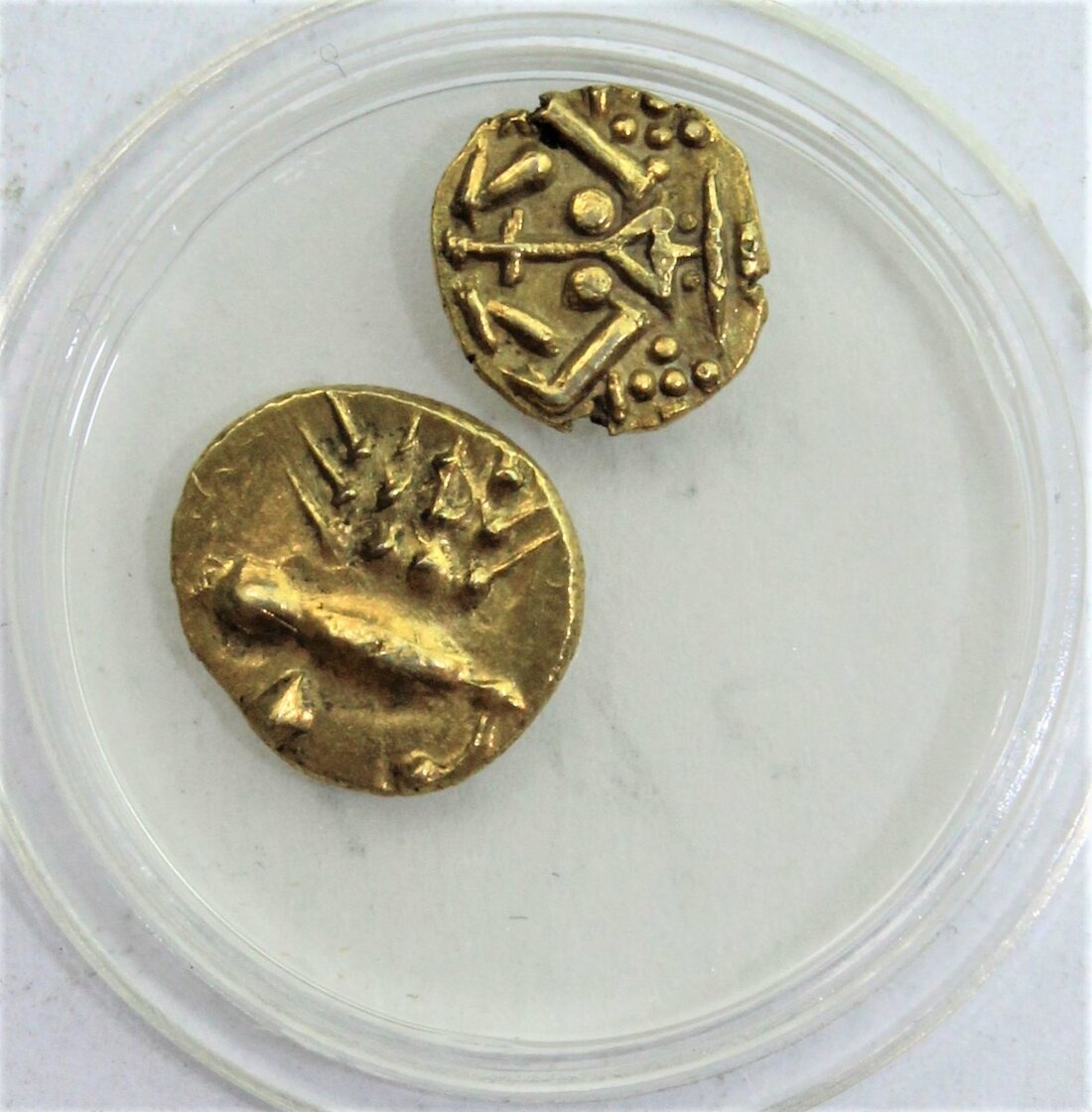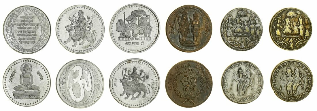 Indian States, Gold Fanams [3], extremely fine to much as struck; Souvenir 'Temple' Tokens, Bombay 999, Goddess Durga Devi, Bhagawan Mahavir; 'Jai Maa Sherawali' rev inscribed 'Jai Mata Di'; East India Company, Laxmi and Narayan, 1839, rev inscribed 'OM', '786'; 'Rama-Lakshmana' [2], Rama's coronation, genrally very fine, or better [8]