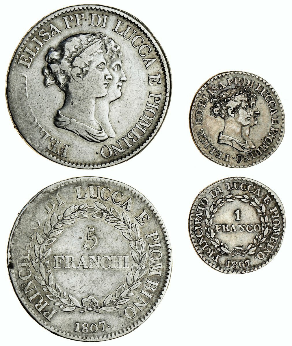 Italy, Lucca and Piombino, Elisa and Felix (2), 5-Franchi, 1807 (KM 24.3); also, Franco, 1807 (KM 23), the first cleaned, the second lightly wiped, otherwise fine to very fine, both scarce (2)