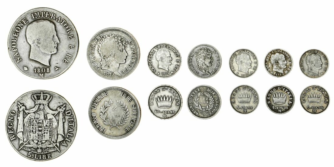 Italy, Milan, First French Empire [7], Napoléon Bonaparte [5], 5-Lire, 1808-M; also, 10-Soldi, 1814-M; lastly, 5-Soldi (3), including 1810-M; 1812-M; 1813-M (Mont. 219, 272, 274, 275; Gig. 103; KM 10.1; C6.1); additionally, Naples, Joachim-Murat Napoléon (1808-15), 2-Lire, 1813 (Pag.60e; Gig. 13), Mezza-Lira, 1813 (Pag.63a; Mont. 511; KM 108), fair to fine, the last pieces scarce [7]