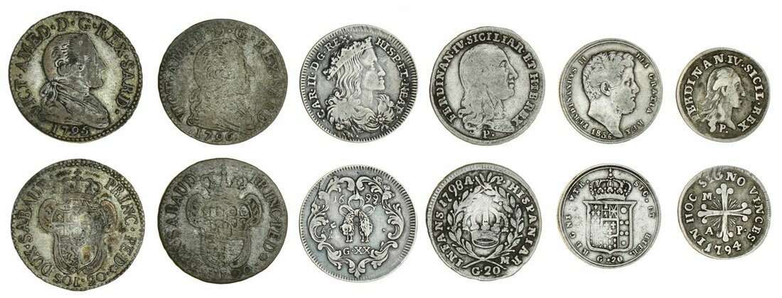 Italy, Naples, silver coins [4], including: Unified Kingdom with Sicily, Charles II of Spain (1665-1700), Tari {20-Grana}, 1699 (CNI 352; MIR 300.8), rubbed and with adjustment marks, otherwise fine, scarce; also, Ferdinand IV of Bourbon (1759-1825) [2], Tari {20-Grana}, 1798-A P (MIR 386; Mont. 247); another, Carlin {10-Grana}, 1794-A P (Mont. 254), Kingdom of Two Sicilies, Ferdinand II of Bourbon (1830-59), 20-Grana, 1836 (CNI 72; MIR 508.5), cleaned, almost fine, scarce; Sardinia, Victor Amadeus II 20-Soldi [2], 1795; 1796 (Mont. 372), generally fine ir near so [6]