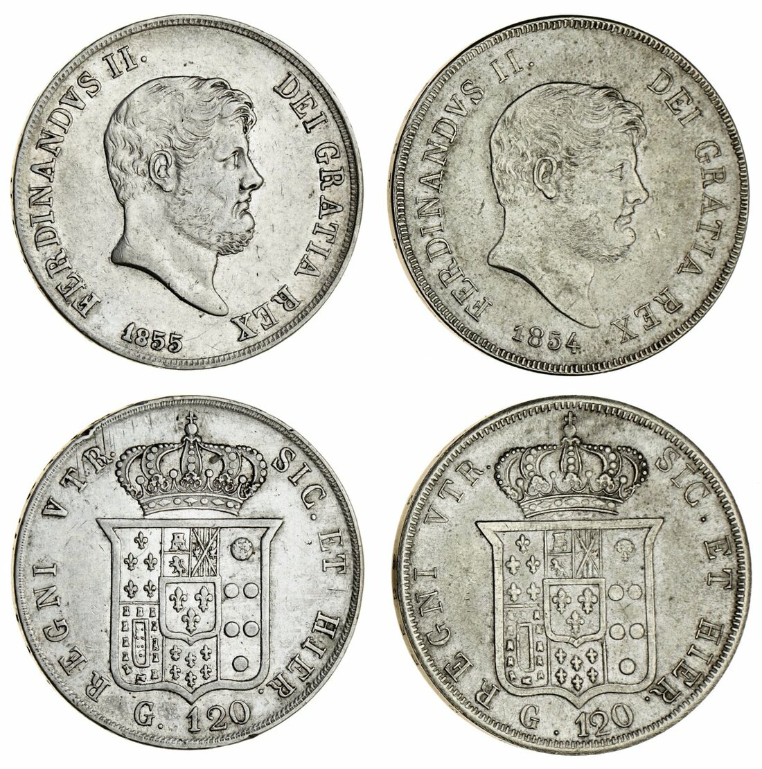 Italy, Naples, Ferdinand II (1830-54), Piastra of 120-Grani (2), 1854; 1855 (Pag. 219, 220a; Gig. 85-86; P/R 83-84), both once wiped, otherwise very fine or better (2)