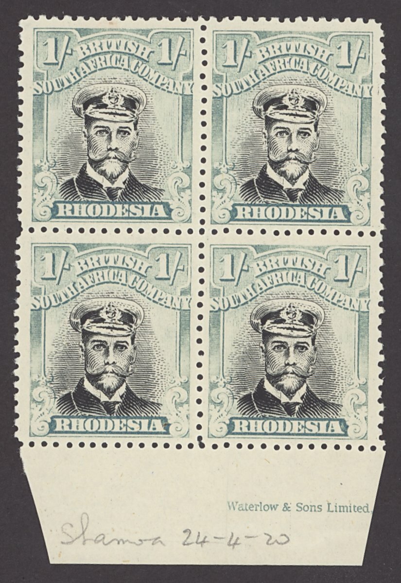 Perforated 14, 1/- black and pale blue-green marginal block of four with part imprint at foot, endorsed 'shamva 24-4-20' at foot, unmounted mint. S.G. 272