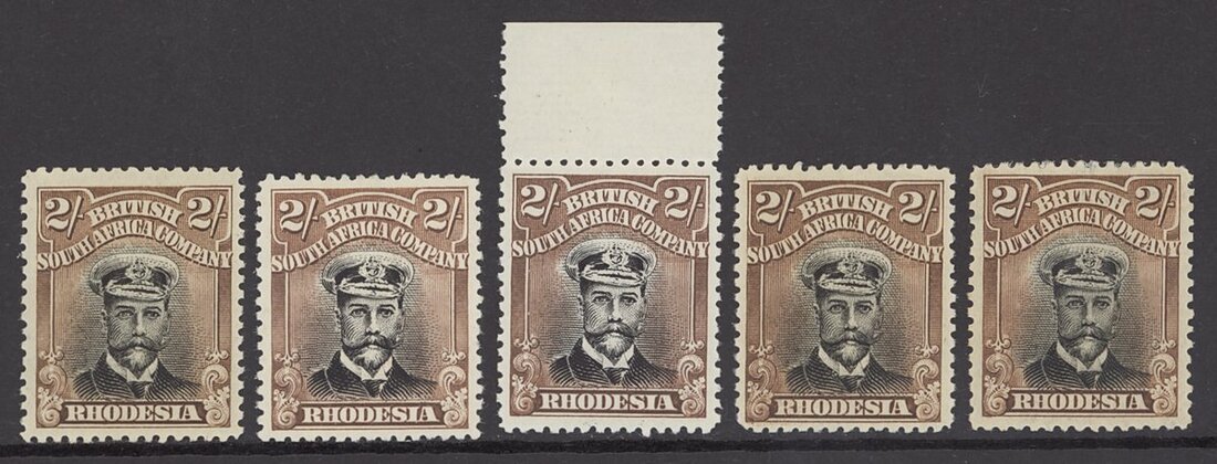 Perforated 14, 2/- black and brown (5, shades) one with margin at top,  fine and fresh with large part original gum. S.G. 273 group