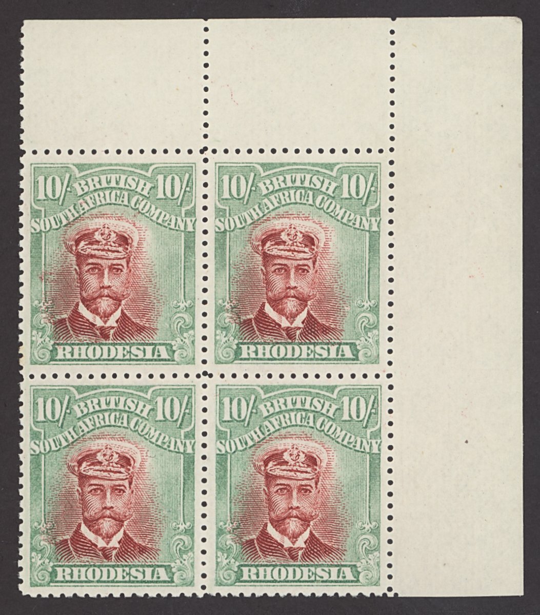 Perforated 15, 10/- brown-lake and light green block of four from the upper right of the sheet, unmounted mint; a rare multiple. S.G. 253