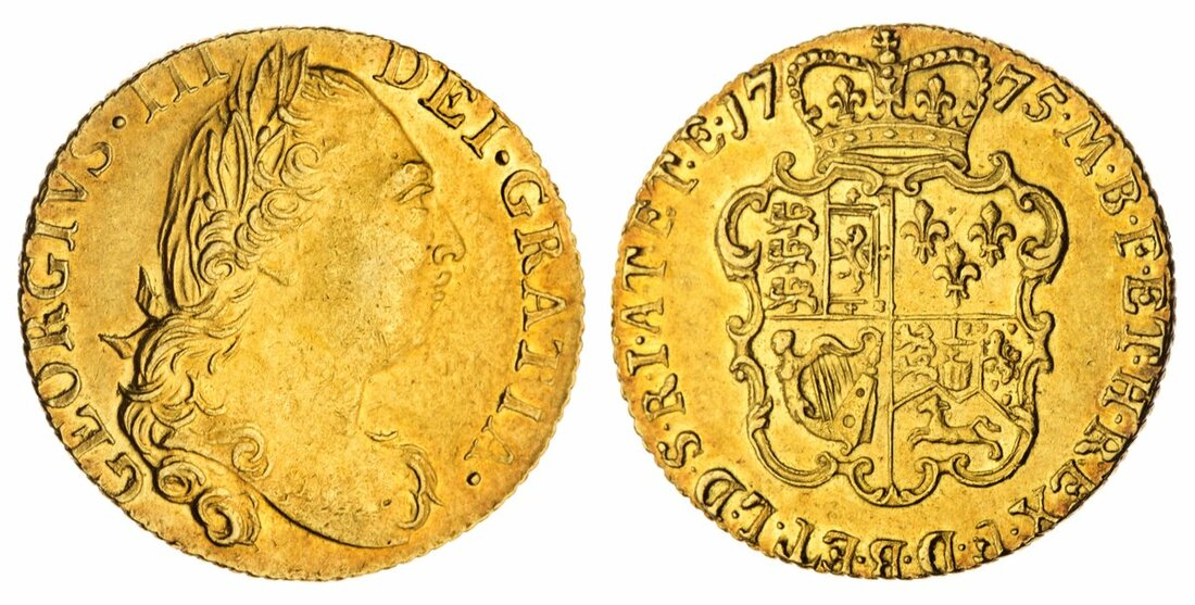 AU58 | George III (1760-1820), 'Rose' Guinea, 1775, fourth head, edge obliquely milled, 8.39g, 6h (Farey 1150; EGC 691; MCE 380; Spink 3728), toned and residually lustrous, good very fine, in NGC holder, graded AU58 (Cert. #6295128-005)