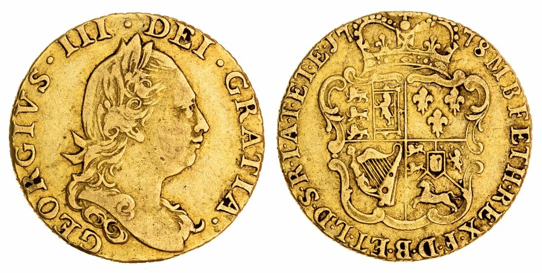 George III (1760-1820), Half-Guinea, 1778, fourth laureate head right, rev. crowned and garnished shield, edge obliquely milled, 6h (EGC 820-821; MCE 421; Spink 3734), possibly from a mount with a bruise at obverse 6 o'clock, rubbed, fine