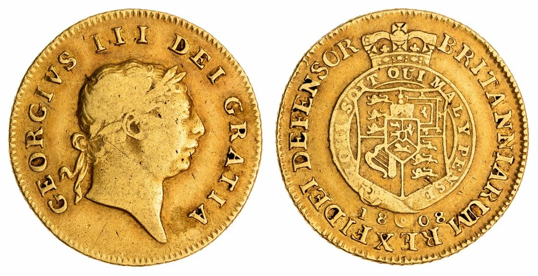 (g) George III (1760-1820), 'Garter' Half-Guinea, 1808, seventh head, edge obliquely milled, 4.21g, 12h (Murdoch III, -; Schneider II, -; MCE 444; Spink 3737), some file marks at 2 o'clock and rubbed, only good to fair, but a more unusual date of issue