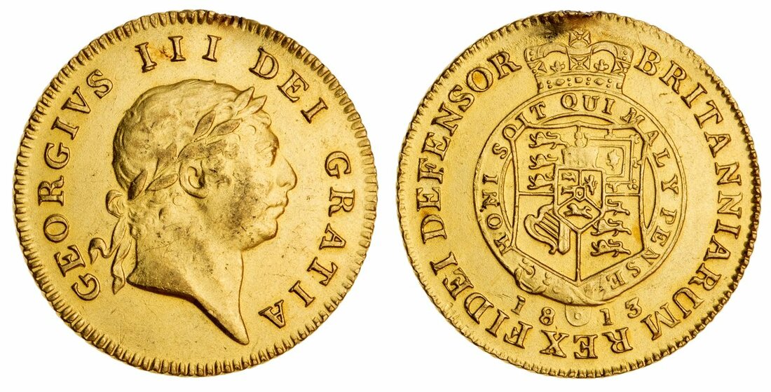 (g) George III (1760-1820), Half-Guinea, 1813, seventh laureate head, edge obliquely milled, 4.20g, 12h (Selig 1065-66; Stratos 50; EGC 859; MCE 448; Spink 3737), wrenched from a mount with buckling to flan at 12 o'clock, flashed and gilt, otherwise struck details a bolder very fine, a popular compliment to the 'Military Guinea' of the same date