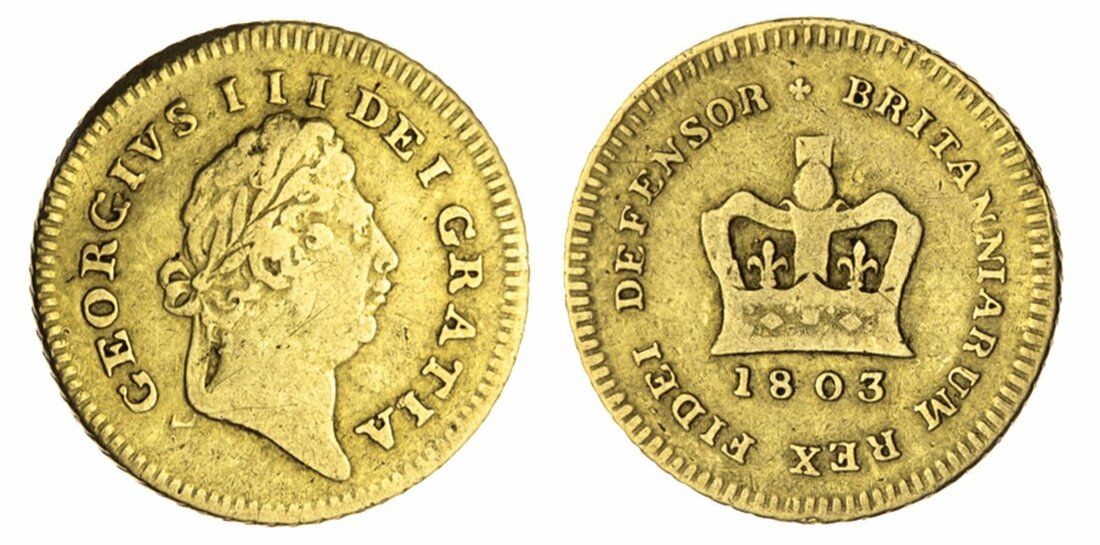 George III (1760-1820), Third-Guinea, 1803, laureate head right, rev. crown with date below, edge obliquely milled, 2.73g, 12h (Spink 3740), a handful of hairline scratches, lightly rubbed, otherwise near very fine, in NGC holder, graded VF Details ~ Cleaned (Cert. #6295135-003)