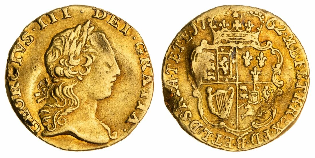 George III (1760-1820), Quarter-Guinea, 1762, edge obliquely milled, 2.09g, 6h (Stratos 25-26; Schneider II, 627; MCE 463; EGC 886; Spink 3741), creased and crimped, struck details a bolder fine
