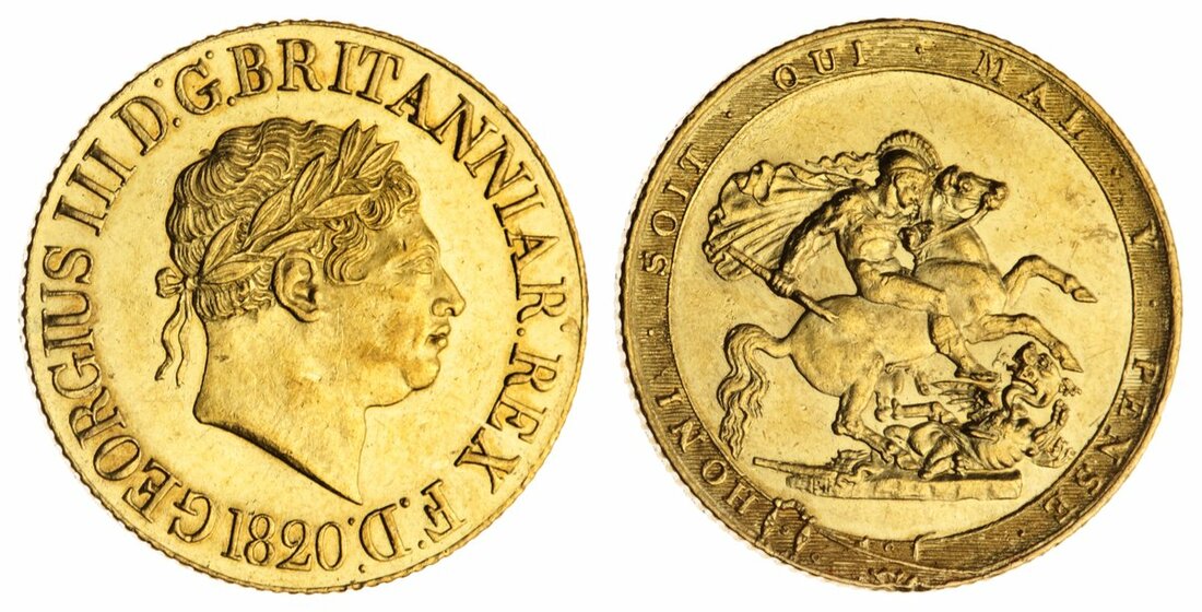 (g) MS62 | George III (1760-1820), 'New Coinage', Sovereign, 1820, 'Closed 2', Small Date, edge milled, 8.00g, 5h (Bentley 8; Stratos - [cf. 118]; Marsh 4B; Schneider II, 630; MCE 466; Spink 3785C), lightly wiped and resultantly bright, nevertheless residually lustrous, almost extremely fine, in NGC holder, graded MS62 (Cert. #6295129-002)