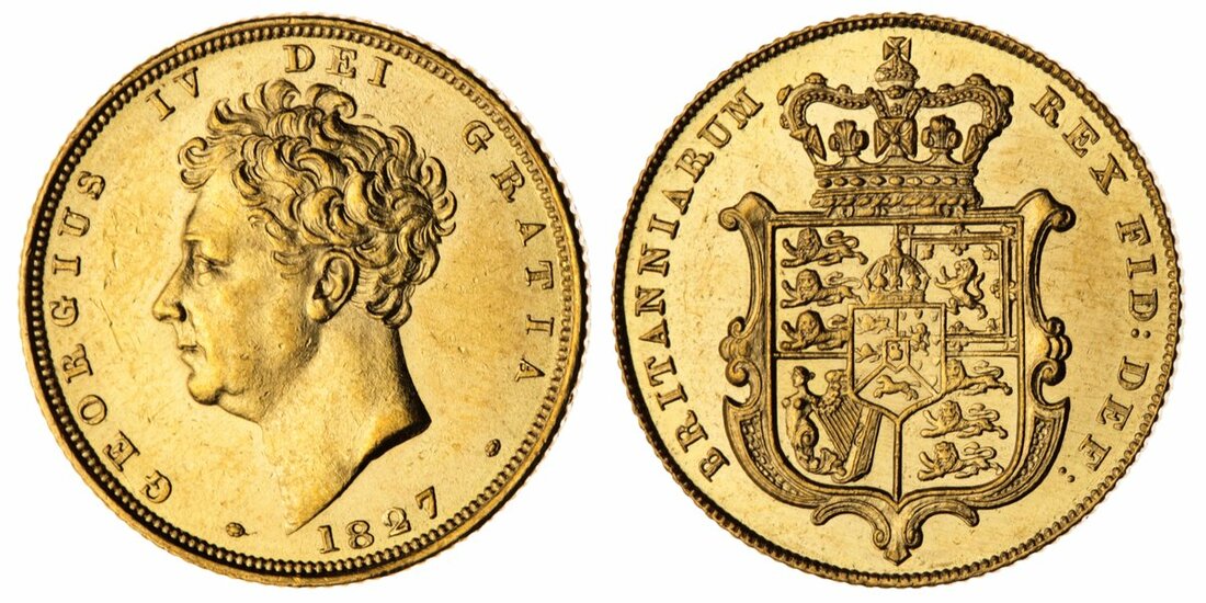 (g) MS62 | George IV (1820-1830), Sovereign, 1827, Type 2, bare head left, rev. crowned garnished shield, edge milled, 8.01g, 7h (Marsh 12; MCE 478; Stratos 127; Spink 3801), lightly wiped and bright, otherwise lustrous, nearly extremely fine, in NGC holder, graded MS62 (Cert. #6295129-003)