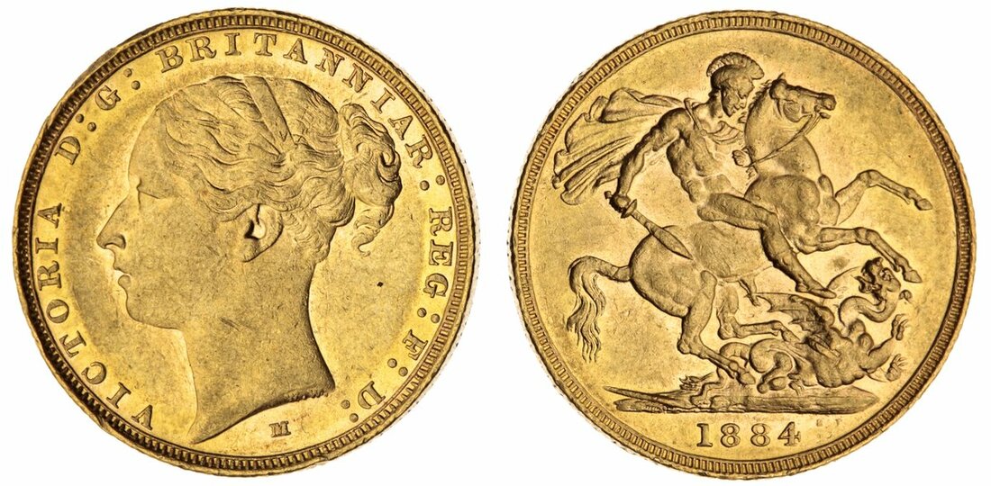 (g) Victoria (1837-1901), Sovereign, 1884 M, second head left, rev. St George and dragon, milled edge, 7.98g, 6h (Marsh 106; Spink 3857C), some light surface marks and flaw to edge at 11 o'clock, otherwise residually lustrous, especially in legend, near extremely fine
