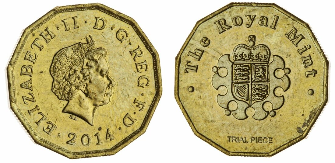 Decimal Trials | Elizabeth II (1952-), Royal Mint Dodecagonal Trial Piece, Pattern for a Pound, 2014, in nickel-brass, fourth crowned portrait right, by Ian Ranklin-Broadley, micro lettering at rim, rev. The Royal Mint, official emblem, TRIAL PIECE below, edge with alternating sides of 12-grained straight milling, 22mm., 8.91g, 12h, light handling marks, otherwise quite brilliant, a bold extremely fine, very rare and an important trial coin in the long and illustrious history of this currency unit