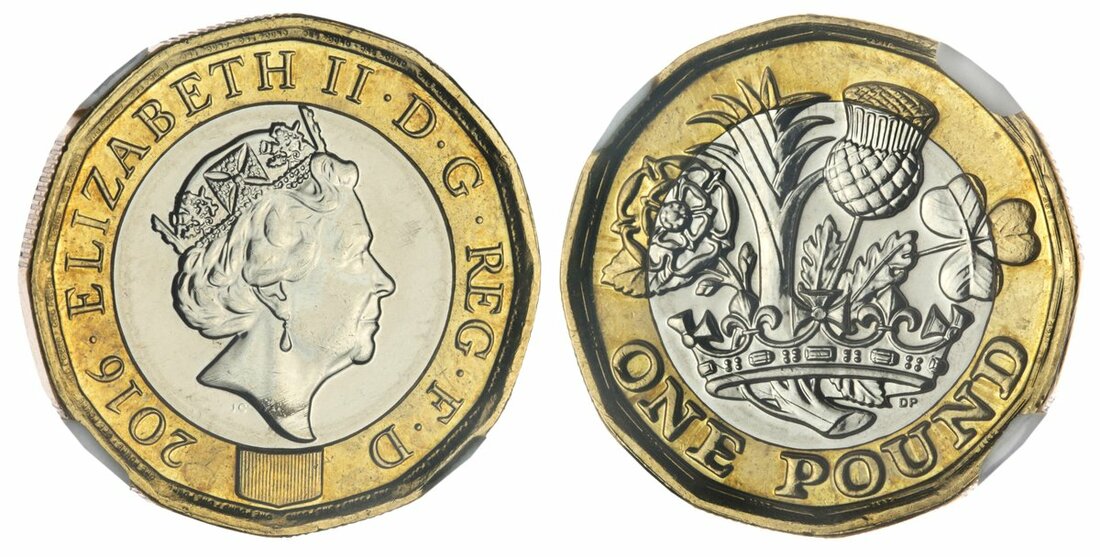 The Astonishing 2016 '2017 Micro Date Lettering' Mule | MS66 | Elizabeth II (1952-), Mule One Pound, 2016 / 2017 'Micro Date Lettering' Mule, ELIZABETH. II. D.G. REG. F.D, crowned head right, rev. rose, leek, thistle and shamrock within crown, intermittent milled edge (Spink J39), light contact marks to obverse high points, especially to neck, otherwise lustrous and much as issued, muled with reverse dies for 2017, excessively rare and an highly important error coin in the Decimal series thus, in NGC holder, graded MS66 (Cert. #6135257-001)