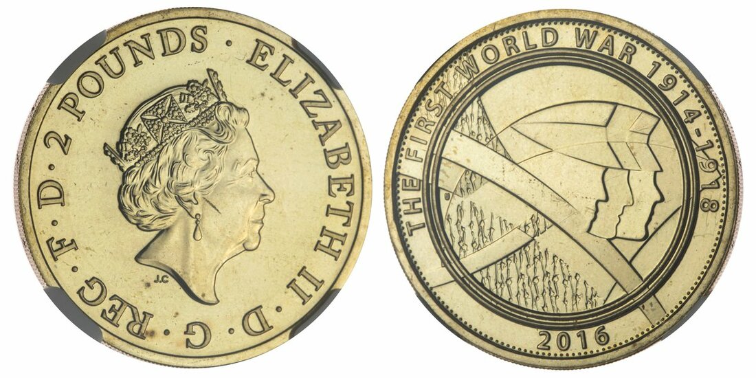 'The Holy Grail of Bimetallic Errors' | MINT ERROR MS64 DPL | Elizabeth II (1952 -), 'First World War Centenary' Two-Pounds, 2016, 'Pals Battalions', on a monometallic nickel-brass planchet (76% Cu; 4% Ni; 20% Zn), fifth crowned head right, by Jody Clark, rev. stylised silhouettes of the British Army 'Tommies', by John Bergdahl, FOR KING AND COUNTRY milled edge upwards, 12.00g, 12h (cf. Spink K41), some slight friction and a dragmark by ear, otherwise brilliant, practically as struck, a truly astonishing and nigh-on inconceivable mint error, presumed UNIQUE, in NGC holder, graded MS64 DEEP PROOFLIKE (Cert. #6135243-001)