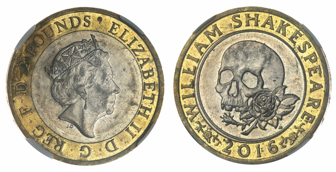 MINT ERROR AU53 | The First Lettered Error Edge Mule on a British Coin Since 1847 | Elizabeth II (1952 -), 'Shakespeare' Two-Pounds, 2016, 'Tragedies', fifth crowned head right, by Jody Clark, rev. Skull and Rose, FOR KING AND COUNTRY milled edge downwards, 12.05g, 12h (Spink K40A), faint nailmarks to fields and devices, stain to obverse legend, otherwise somewhat lustrous, bold very fine, an historic error, the first to be encountered on a British coin since the DECIMO SEPTIMO muling of the 1847 Gothic Crown, in NGC holder, graded MINT ERROR AU53 (Cert. #6135258-002)