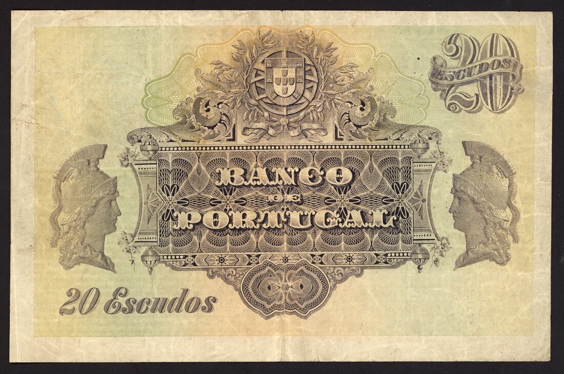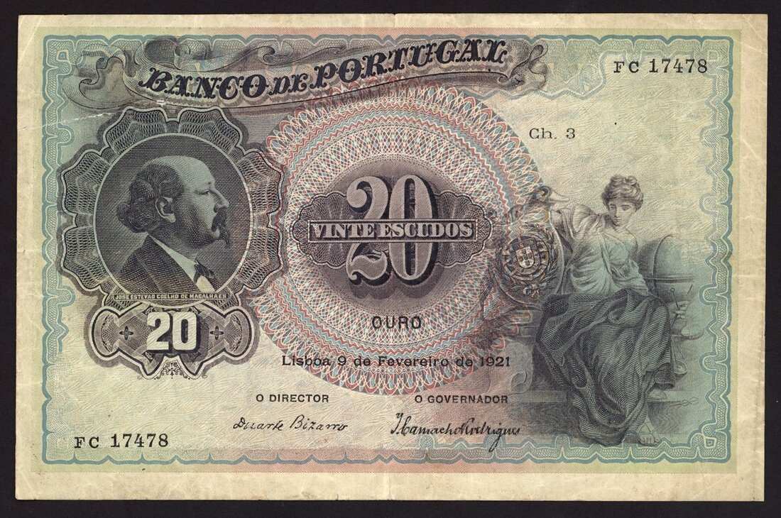 (x) Banco de Portugal, 20 escudos, 9 February 1921, serial number FC 17478, Ch 3, blue-green and purple, Jose de Magalhaes at left, maiden at right with Portuguese arms, reverse pale orange-brown, medallic female head at left and right, arms top centre