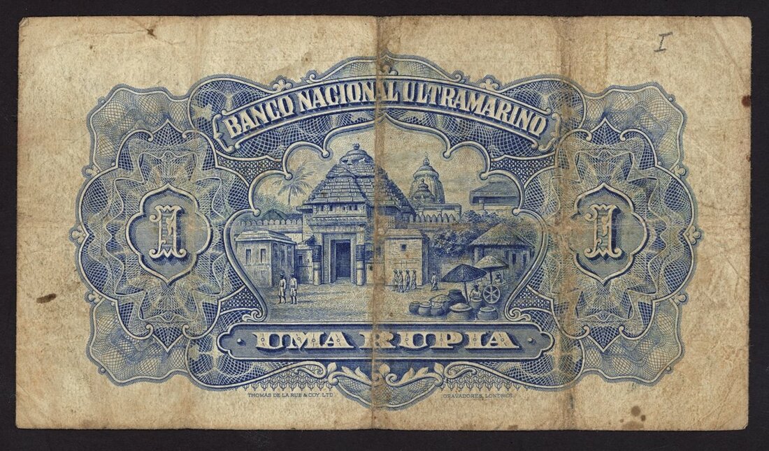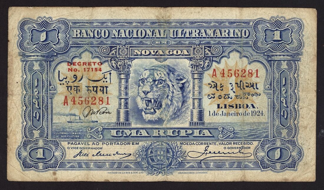 Banco Nacional Ultramarino, Portuguese India, 1 rupia, 1 January 1924 (1929), red serial number A 456281, blue and pale pink and brown, tiger at centre, arms low centre, signatures of Mendonca and Ulrich, red DECRETO top left, reverse blue, huts