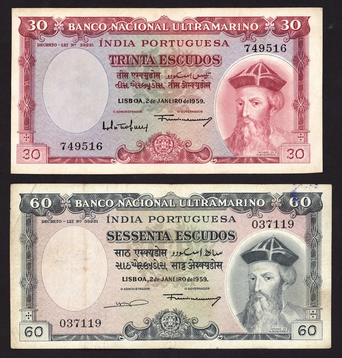 Banco Nacional UItramarino, Portuguese India, 30, 60 escudos, 2 January 1959, (Pick 41, 42, TBB B330, B331), 30 escudos very fine, 60 escudos fine (2 notes)