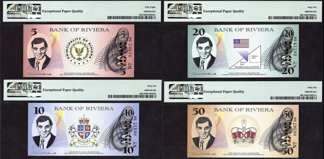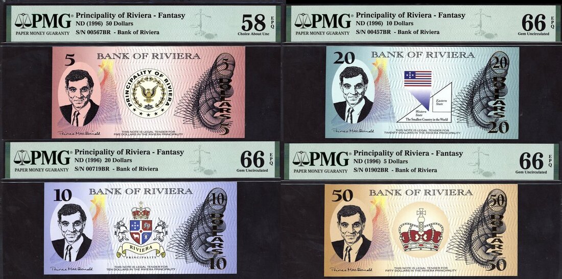 Principality of Riviera, 5, 10, 20, 50 (1996), in PMG holder 66 EPQ, 66 EPQ, 66 EPQ, 58 EPQ (4 notes),